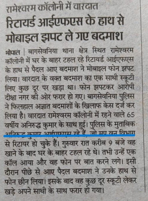 मैं अपनी गेटेड कॉलोनी के बाहर रात्रि भोजन के उपरान्त सैर कर रहा था और जैसे कि मैं आमतौर पर करता हूं, मैं अपने मोबाइल पर एक मित्र से बात कर रहा था। अचानक, मुझे अपनी कनपटी पर एक हलका झटका महसूस हुआ। मुझे एक सेकंड का समय लगा यह समझने में कि जो मोबाइल मैंने अपने कान के पास रखा था, वह अब मेरे हाथ में नहीं था। मैंने तुरंत पीछे मुड़कर देखा और पाया कि एक युवक, जो काले कपड़े पहने हुए था, मुझसे विपरीत दिशा में तेजी से दौड़ रहा था। वह पहले ही बीस फीट आगे था लेकिन मैंने उसका पीछा करना शुरू किया l वह हिरन की तरह कुलांचे भर रहा था और मैं बत्तख की चाल चल रहा था l