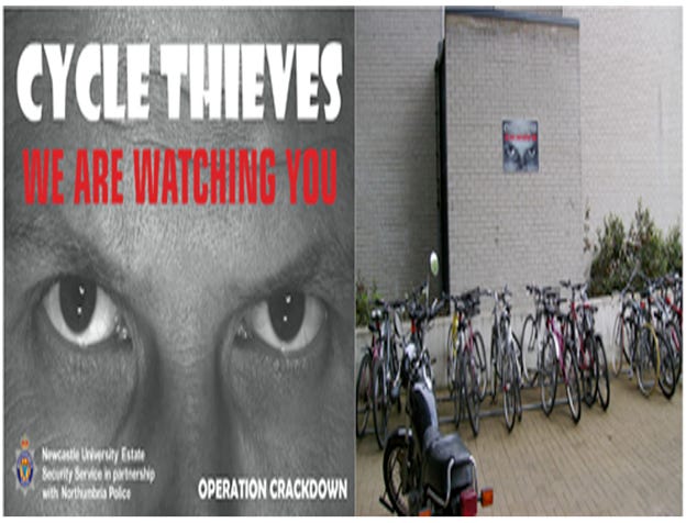 इस संबंध में किसी विदेशी विश्वविद्यालय परिसर में एक मनोवैज्ञानिक प्रयोग किया गया था। वहां साइकिल चोरियों को कम करने के लिए, अधिकारियों ने बड़े बड़े पोस्टर लगाए, जिसमें घूरती आंखों के साथ यह चेतावनी लिखी थी कि चोरों पर निगरानी रखी जा रही है। प्रयोग से यह पाया गया कि कोई अतिरिक्त सुरक्षा उपायों के बिना, केवल पोस्टरों से ही ही साइकिल चोरियों में गिरावट आ गयी थी । अच्छी तरह से डिजाइन किए गए पोस्टर विश्वविद्यालय के लिए नैतिकता के प्रभावी प्रहरी साबित हुए।